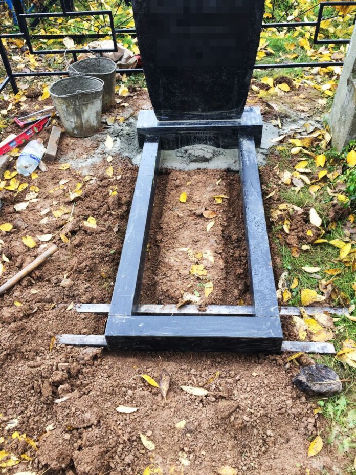 Устройство фундамента (бетонного или плитного основания), что предотвращает проседание и наклон памятника.
