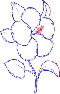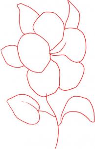 Наметьте пять лепестков немного угловатыми линиями, а из центра торчит тычинка. На заднем фоне сделайте листья. Внизу проведите изогнутую линию стебля и по бокам листья.