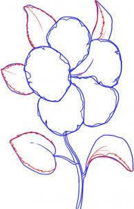 Далее изобразите листья цветка. Они больше по размеру, чем лепестки.