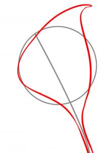 Наметьте цветок большим кругом. По центру проведите вертикальную линию, ниже круга линия немного изогнута. И по бокам наметьте линии листьев.