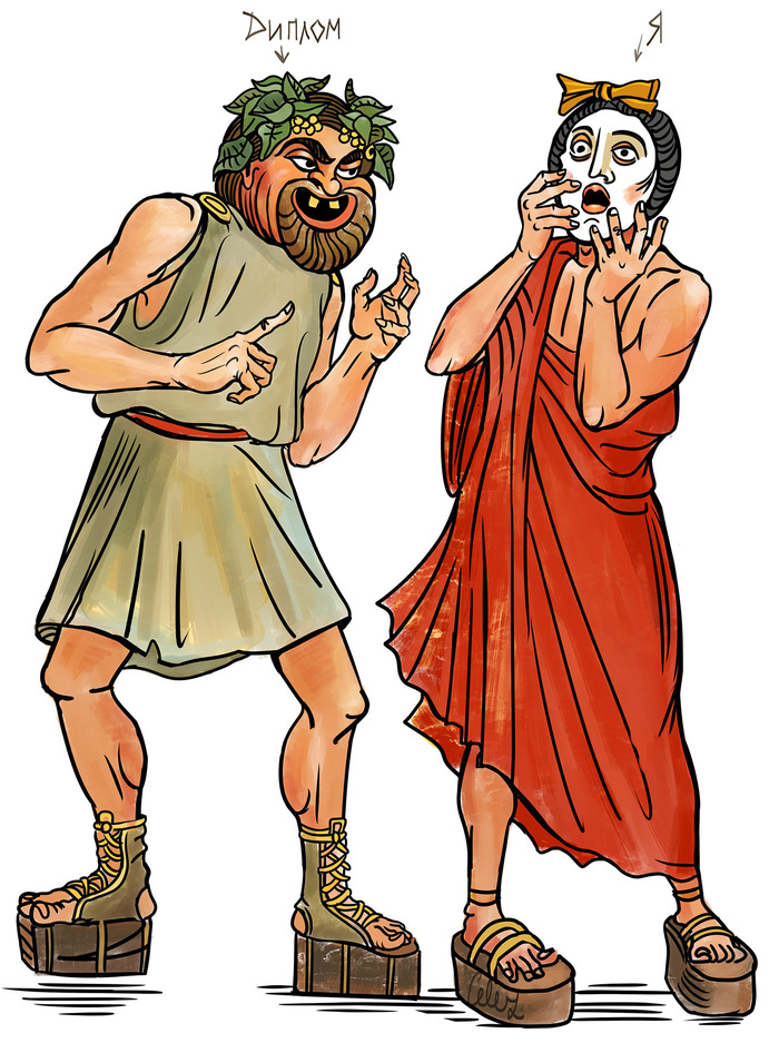 Напоследок — котурны. Это обувь на высокой подошве, которую носили актеры в древнегреческом театре. Также они использовали маски, выражающие различные эмоции. Образы масок я взял с римской мозаики 2 века, ибо эти физиономии мне давно нравились.