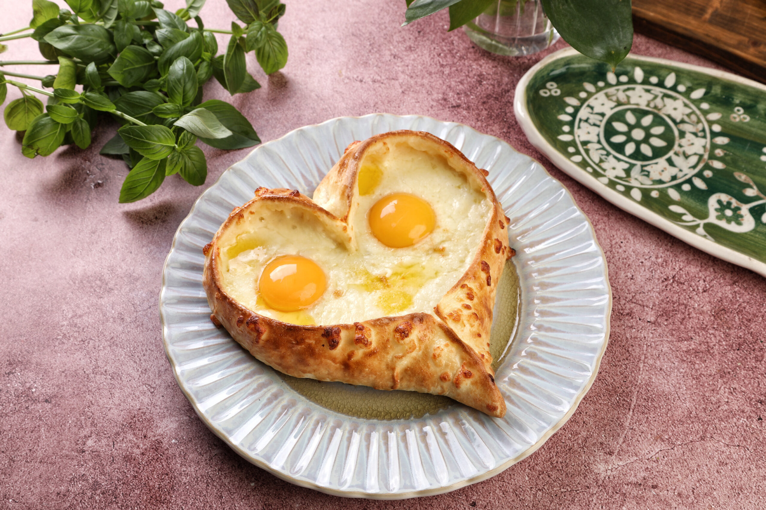 - Аджарские хачапури — «лодочка» с сыром, яйцом и маслом. Яркое блюдо, которое впечатляет не только вкусом, но и подачей.